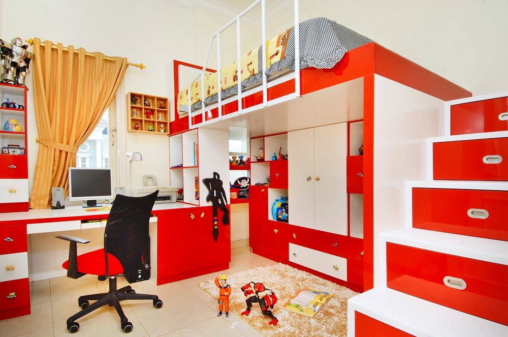 Memiliki kamar kos yang hadir dengan dipan tempat tidur yang tingkat, adalah salah satu referensi desain kamar kos dengan pesona yang menarik, dengan interior desainnya yang semuanya fungsional. Bagian atasnya sendiri bisa anda gunakan untuk ranjang, dan pada bagian bawah bisa untuk meja belajar, serta bagian anak tangga dipan, dibentuk lemari – lemari kecil seperti laci, sehingga hampir semua komponen pada tempat tidur warna merah ini, semuanya memiliki fungsi yang menarik.
