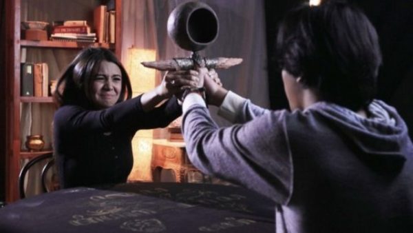 dan menjatuhkan buku-buku yang tadinya tersusun rapi. Anak kecil itu sadar kalau sedang dilihat oleh penghuni kos, hingga akhirnya sosok itu tersenyum dan lansung menghilang. Ih, ngeri!
