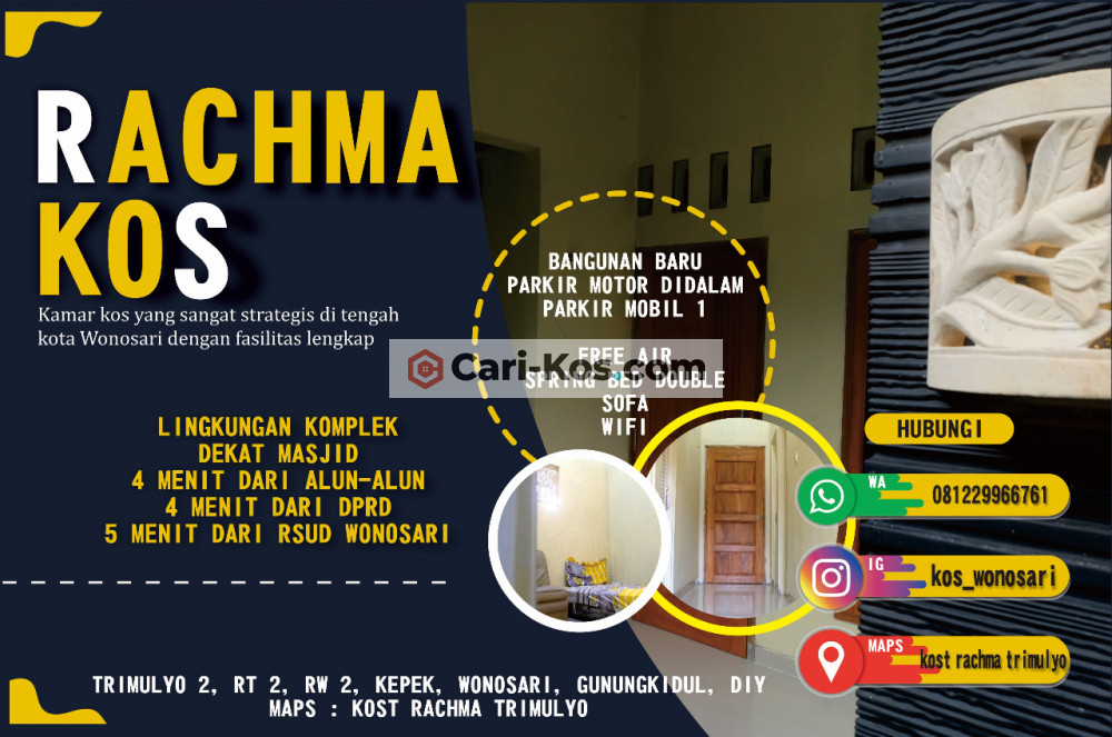 Kamar kos yang sangat strategis di tengah kota Wonosari dengan alamat Trimulyo 2 RT 02 RW 02, Kepek, Wonosari, Gunungkidul, D.I. Yogyakarta (MAPS : KOST RACHMA TRIMULYO), dekat masjid, 4 menit dari alun-alun, 5 menit dari RSUD Wonosari, 3 menit dari Pasar Argosari Wonosari, dekat dengan perkantoran di wilayah Wonosari, dekat dengan tempat makan , dan swalayan.
