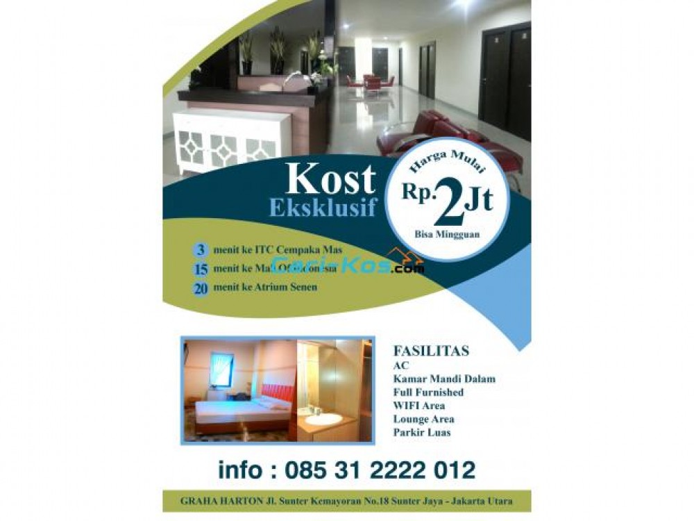 Permisi bapak/ibu. Saya menawarkan tempat Kost - kosan Exclusive di area Sunter Kemayoran. Gedung 3 lantai, setiap lantai di sediakan ruang lobby yang luas. Lokasi sangat strategis dan dapat dijangkau dengan kendaraan umum. Aman, privacy tidak terganggu. Menerima mahasiswa/i, pegawai kantor, pasutri.