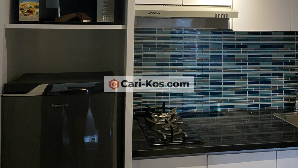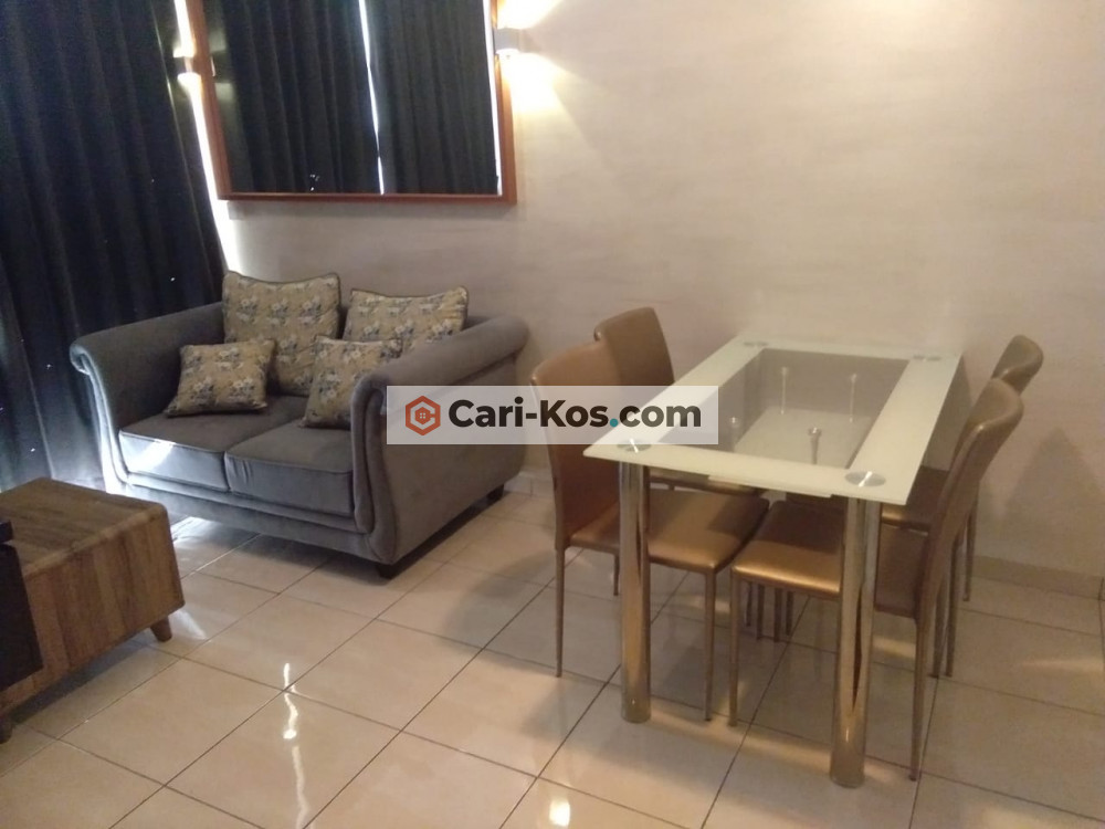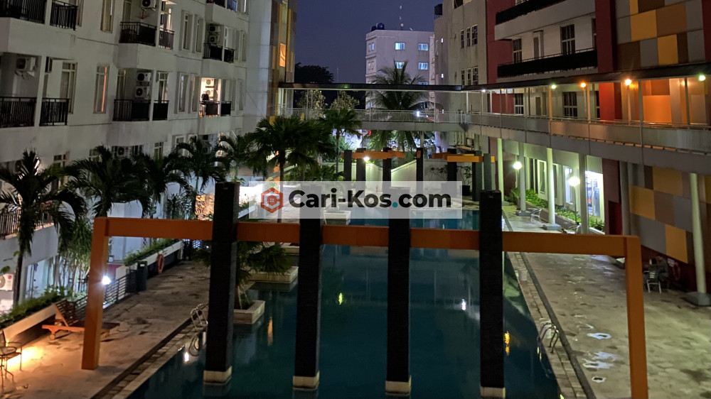 Apartemen 2KT 1KM lengkap dengan perabotan dan nyaman, dispenser galon bawah, balkon menghadap kolam renang.