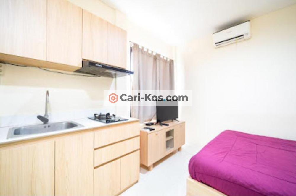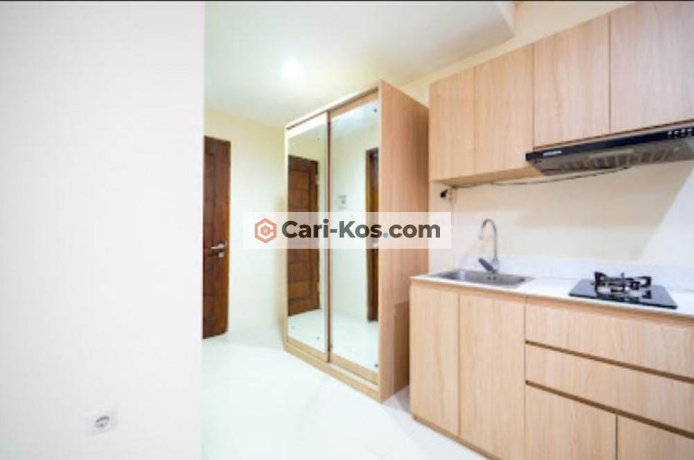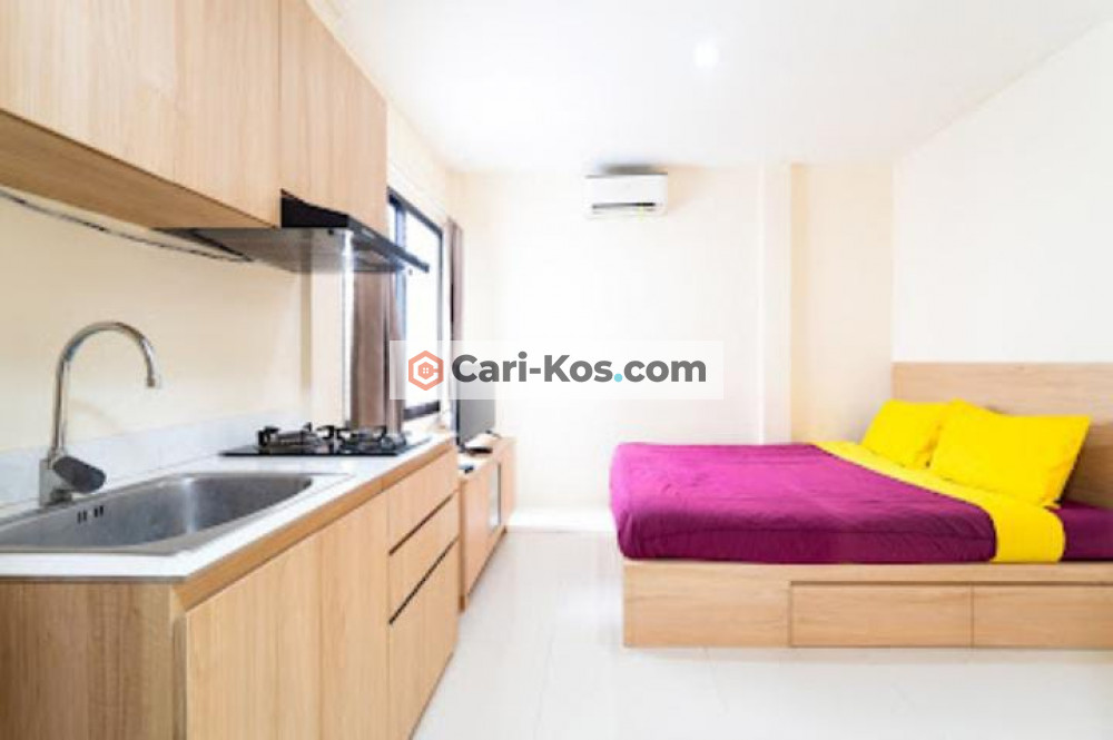 Informasi fasilitas dalam kamar: Daya listrik 1300 VA (Prabayar), AC, TV, Water Heater, Mini Kitchen, Ranjang ukuran queen size (160x200), Toilet duduk, Lemari.