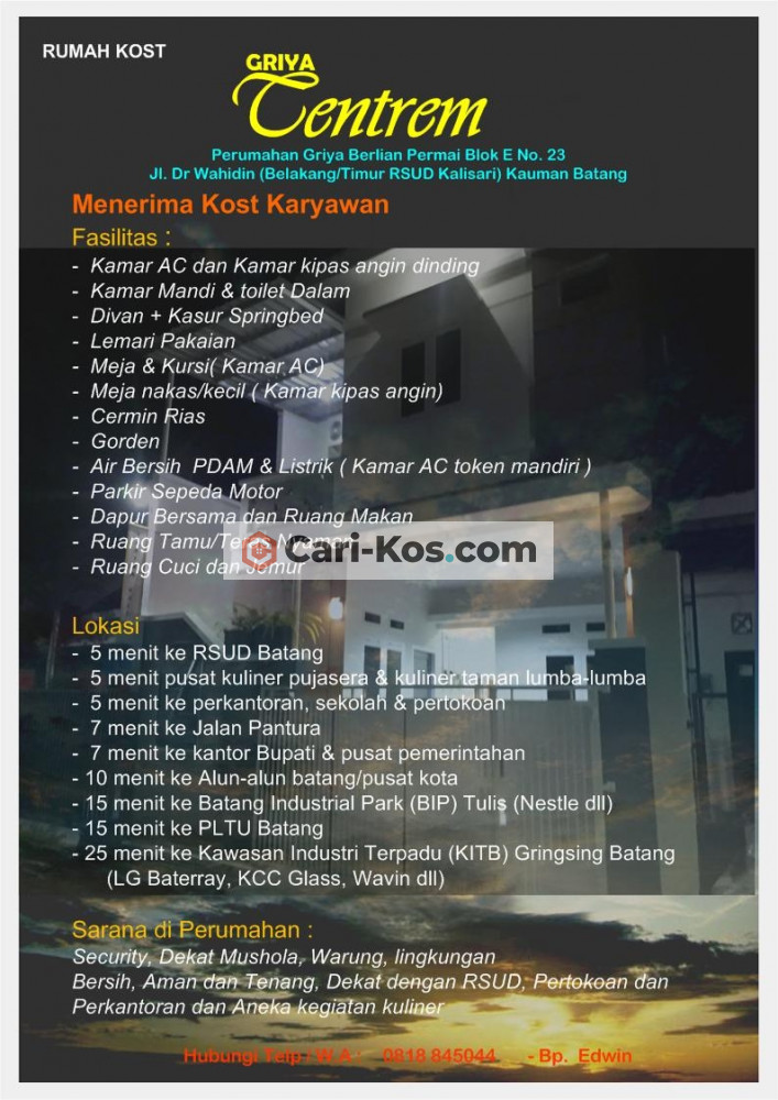 Kost putra di kota Batang dekat dengan Pusat kota, kegiatan perkantoran, kuliner dan perdagangan